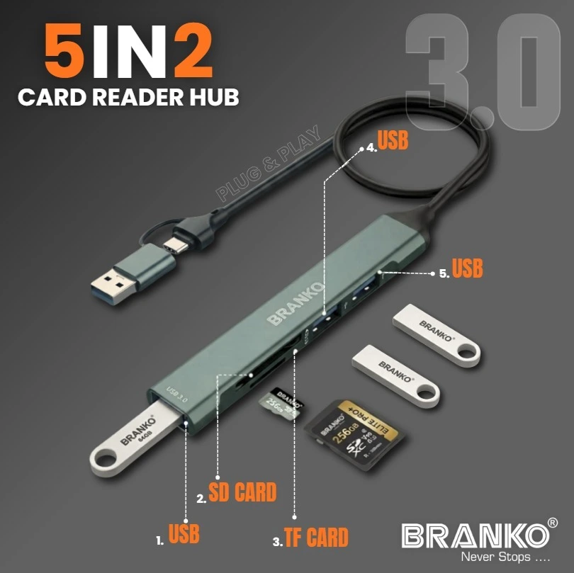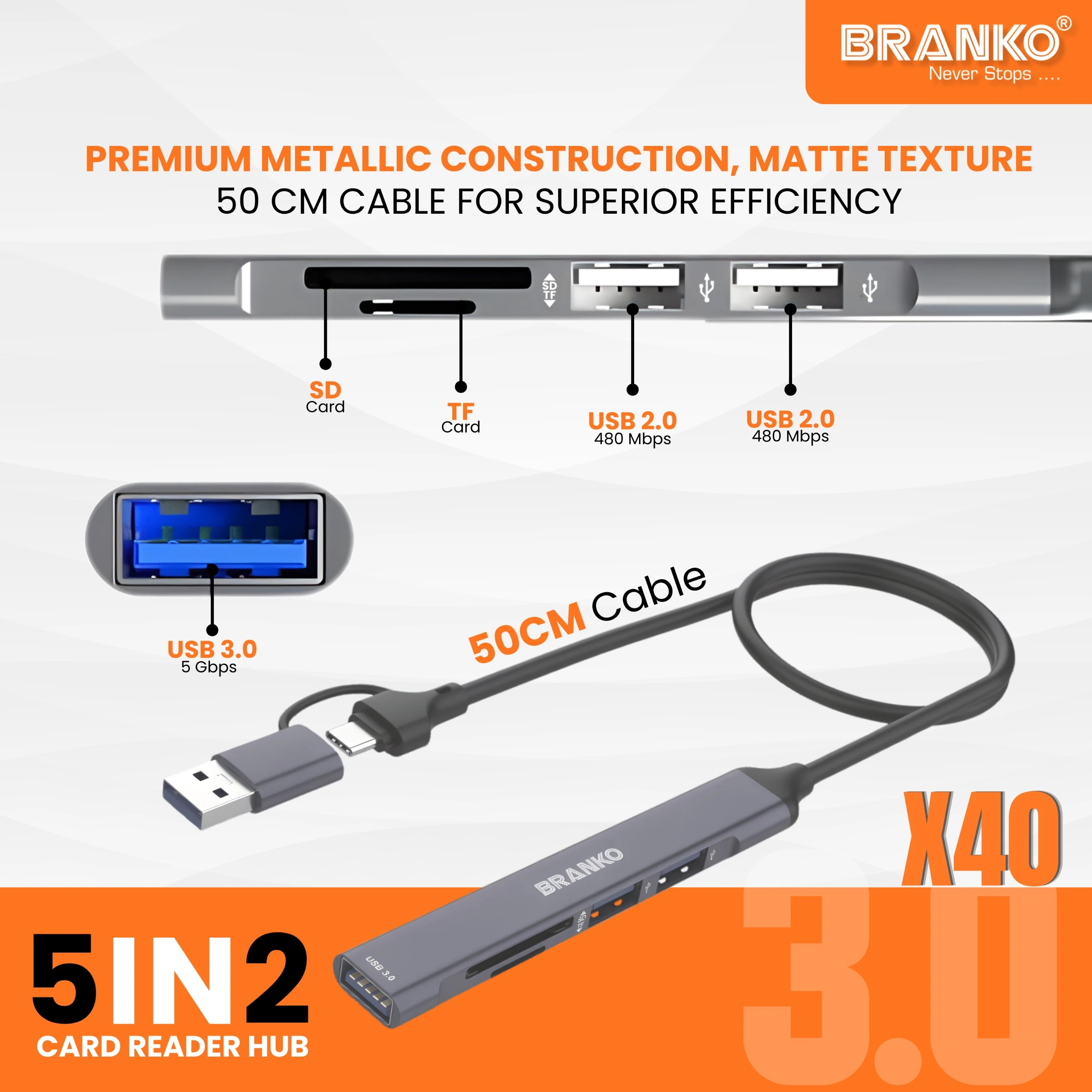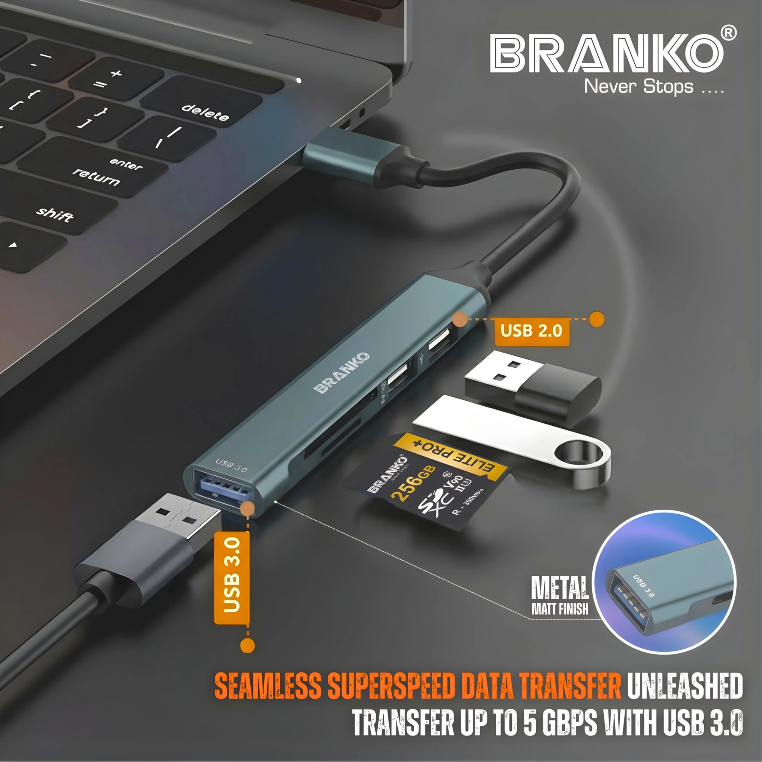 - 5-in-2 USB Hub: Branko Mport 5 USB 3.0 hub is the ultimate multitasker with a 1xUSB 3.0,2xUSB 2.0, SD Card,Microsd Card Reader.